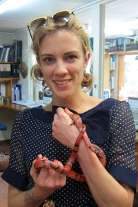 At Melbourne Zoo, I am smuggled ‘backstage’ by friend Lou and settle for a hold of this wee red wriggler, which is smooth, oily and immediately tries to get in my dress (insert Wog Boy-style joke here). It’s not big enough to recall the phallic rearing-cobra nightmares of my childhood, but its devious forays around my waist (this serpent clearly has ambitions to be a belt) scare me off after 30 seconds regardless.