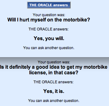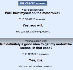 SOMETIMES it seems I’ll do anything to avoid getting my driving licence. The runes on Day 20 were a bit negative about the likelihood of me ever learning, so I’ve decided to ask the oracle if I should get a motorbike licence instead.