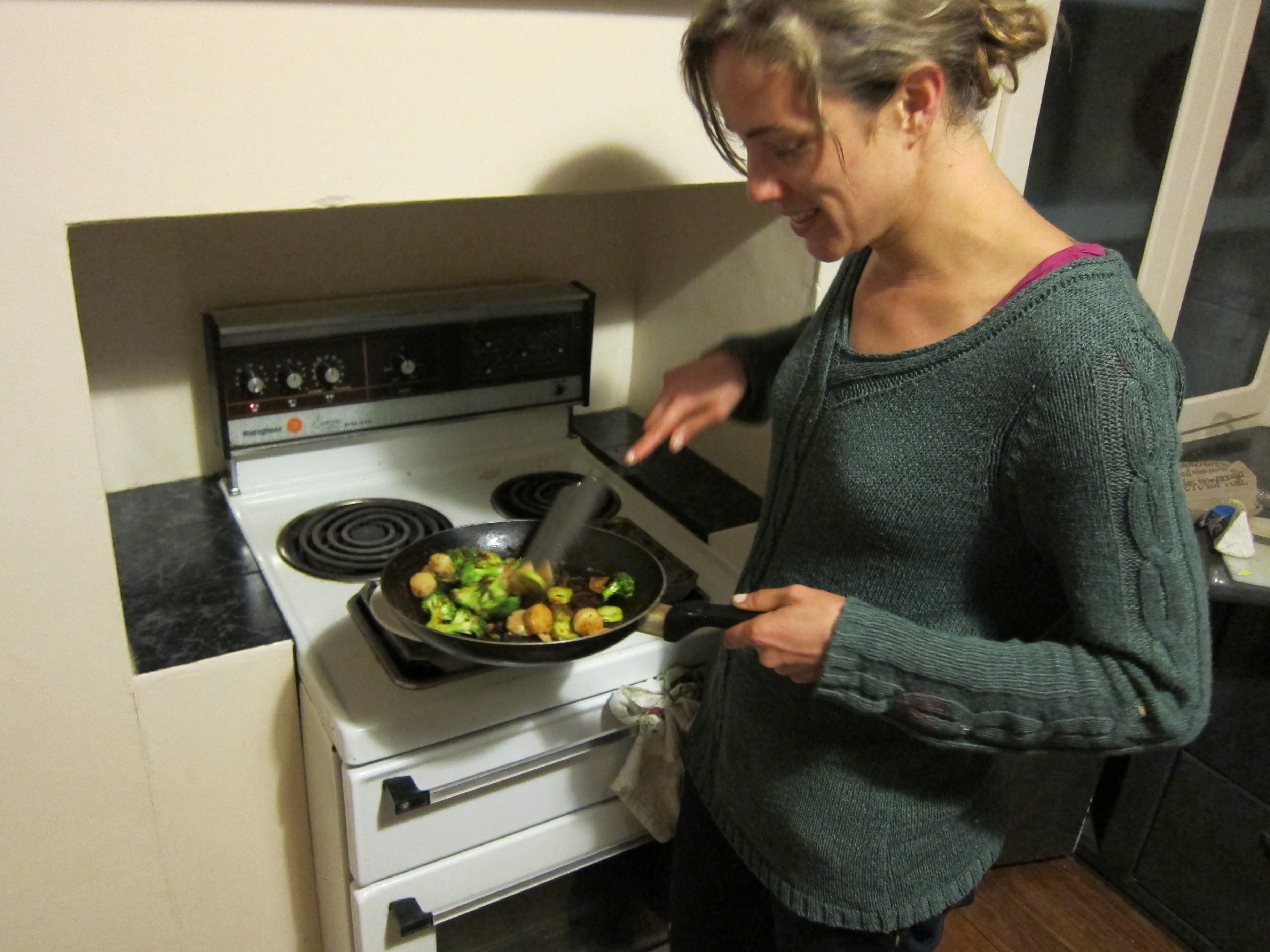 Upping the ante thrillingly from Day 11, in which I ate seafood, I’ve put out the call for suggestions for a seafood dish to cook myself, but since these suggestions ranged from “penguin” to “fish fingers” to the bloody impossible ” bouillabaisse”, I’ve decided to go down the scallop route. I’m pleased to be broadening my practical skills, although I’m mortified when I complain to Helen about the toxic garlic and chilli fumes infiltrating the house, and she pleasantly offers, “That’s why I always shut the kitchen door.”