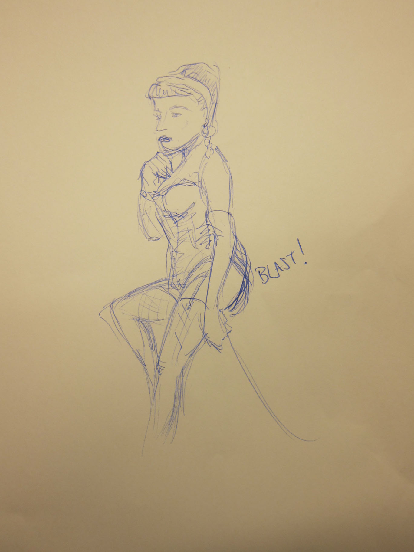 As a glamorous DJ spins ‘Smokey Joe’s Cafe’ and ‘One Bourbon, One Scotch, One Beer’, we’re urged to eat biscuits and candy canes, until there are crumbs all over my depiction of Dolores’ perfect ski-jump nose.